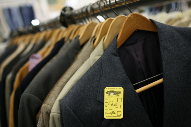 Or it might be the suspicious young Pole who imagines that the moment his back’s turned we’ll all be frantically stuffing Coronet paperbacks down the fronts of our trousers. Or the other young man, psychotic with amiability, who imagines he’s working in haute couture and suavely compliments sir or madam on their excellent and discriminating choice of garment. ‘What lovely material, sir! Such a quality cut! Between us, sir, I’ve had my eye on that one ever since it came in,’ he exults, as he folds some deceased old farmer’s best market-day shirt with elaborate care and guides it reverently into the bag.