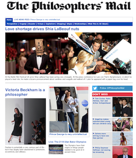 This is why I and some colleagues have this week started a new news outlet called, playfully, the Philosophers’ Mail: www.philosophersmail.com. The website looks identical to the ordinary Mail one, many of the stories are similar, but the content is radically different. The goal of the Philosophers’ Mail is to prove a genuinely popular and populist news outlet which at the same time is alive to traditional philosophical virtues. For too long, philosophers (like serious news-people) have been happy merely to be wise and right. This has offered them huge professional satisfaction but it has not influenced the course of society. The average work of philosophy currently reaches 300 people. Hence the challenge that explains the birth of the Philosophers’ Mail, which is rooted in the popular interests, sensibilities and inclinations of the day — but tries to read and caption the news with an eye to traditional central philosophical concerns; for compassion, truth, justice, complexity, calm, empathy and wisdom. The site views the rolling succession of the day’s news as an occasion for the development of insight, generosity and emotional intelligence.