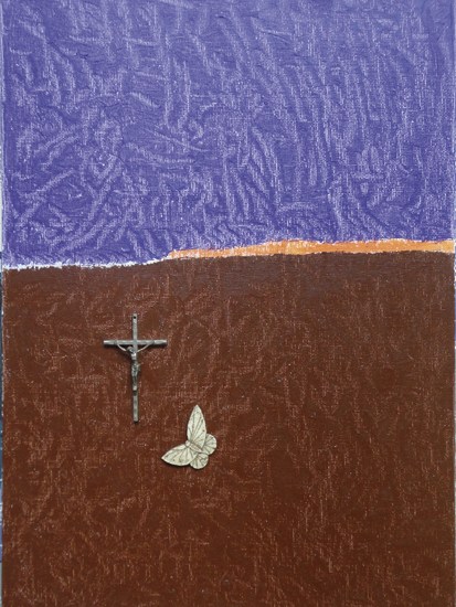 Lambirth’s collages are, by contrast, full of colour. There is nothing raging or bestial about them: true to their Surrealist roots, whatever churning they do is in the mind. Some, like ‘Music in the Head’, are purely abstract; others are artistic tokens of friendship. There are several homages to artist friends such as Craigie Aitchison (above). The most recent, dedicated to Hambling, features a small black scallop shell and a postcard of a crashing wave. The artist’s verdict on the critic’s work? ‘Rather good.’