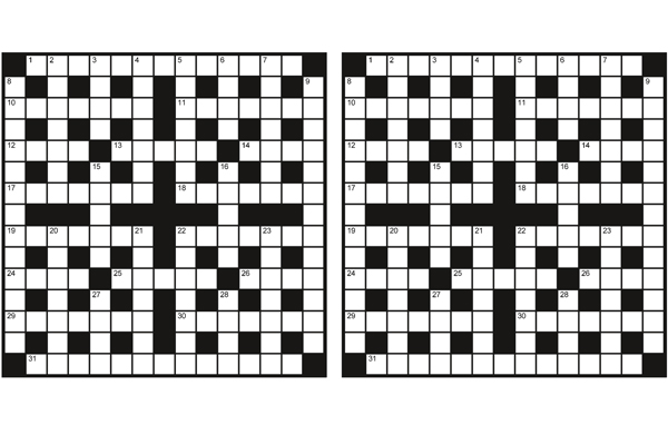 Each clue has two parts run together, but never overlapping, which lead to the two solutions to be entered at the same clue-number in each grid. The solution to the first part of each clue is entered in the left-hand grid, the second part in the right-hand grid. Each clue contains a definition and a consecutive letter-mixture of the two solutions.