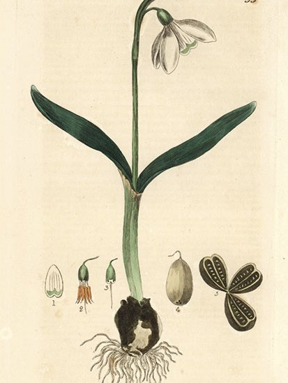 What makes snowdrop mania particularly strange is that unlike tulips, the variations between snowdrops are tricky for a layman to spot. The only really remarkable mutation is one where the ovaries and small markings on the petals are bright yellow rather than green. Other than that, a rare snowdrop looks like a common one: it has green strap-like leaves and white petals that hang down from an arching stem. Why collect something you need to lie flat on your belly to appreciate, especially when it flowers in winter?