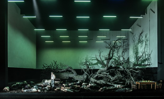 As a concept it’s not a terrible one, scraping the gloss off the myth, demanding we rewrite valorous tales of rebellion and oppression in the balder, blunter terms of today’s conflicts, but in an age of enormous human displacement and violence it generates startlingly little friction. It’s partly the fault of the oversized metaphor that dominates the stage throughout — a tree uprooted (get it?) from the soil, over which all the principals must scramble with varying degrees of ease — but also of a fatal lack of communication between music and action.