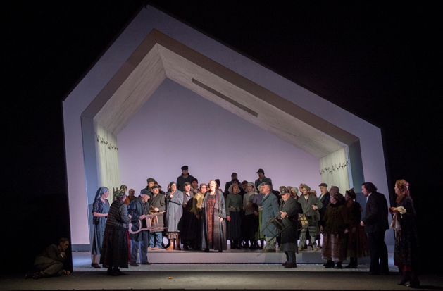 All of this happens inside bright semi-abstract sets dating from the production’s debut in 1995. Combined with Wolfgang Göbbel’s lighting they do an effective job of highlighting the outlines of the drama amid Janacek’s swirling emotional ambiguities. Characters step from pools of light into darkness to confront their thoughts, and the village mob slides backwards as they turn against Jenufa and her stepmother, literally distancing themselves. This still has the potential to be a devastating production of Jenufa, if you could actually hear it.