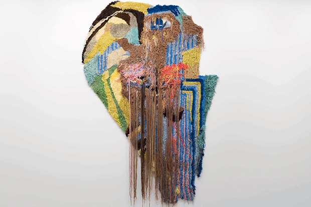 A French-born artist, Caroline Achaintre, was one of several doing unexpected things with what used to be thought crafts, in her case weaving rugs. She has made a number of shaggy textiles that hang on the wall — funny and mildly disturbing — a bit like splashy abstract paintings and somewhat resembling faces or tribal masks.