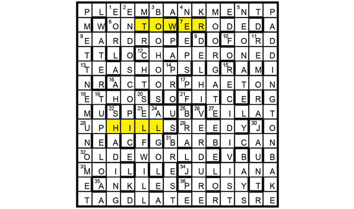 The unclued lights are stations of the London Underground CIRCLE Line. BAYSWATER is the paired theme-word. Solvers had to highlight TOWER HILL in yellow, as per the Line’s colour on a London Tube Map.