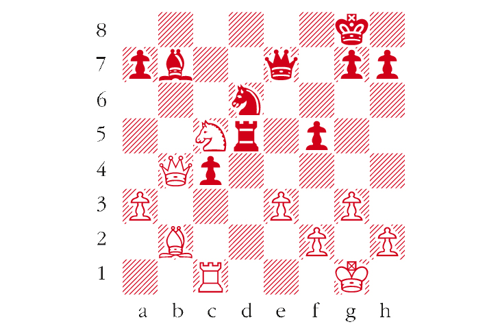 Black to play. This is from Carlsen-Anand, Riyadh Rapid 2017. The needle clash from the Rapid was Anand’s destruction of Carlsen. What was Black’s key move? Answers to me at The Spectator by Tuesday 16 January or via email to victoria@-spectator.co.uk. There is a prize of £20 for the first correct answer out of a hat. Please include a postal address and allow six weeks for prize delivery.