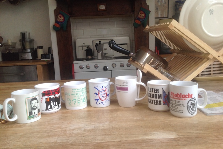 During a dozen years in Belfast I collected a number of political coffee mugs, hailing from both sides of the divide. Unionist designs including the heartbreakingly punctuated ‘Ulster Say’s No’ (not merely to the Anglo-Irish Agreement; no to everything) and the impressively witty ‘Reservoir Prods’: four toughs in shades identified as ‘Mr Orange’ and ‘Mr Boyne’, etc. The republican mugs exhibit no such sense of humour, which won’t surprise you. Martin McGuinness and Gerry Adams stare sternly from their porcelain. Worse, the mugs from the Sinn Fein bookshop are cheaply decorated with decals, which are less robust than the inked unionist ones, and tend to melt in the dishwasher.