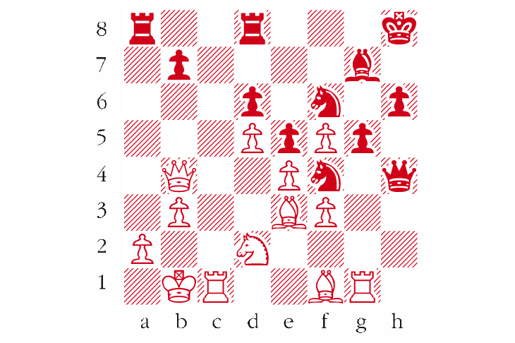 Black to play. This is from Carlsen-Polgar, Mexico 2012. Judit had been struggling in this game but when Carlsen slipped up she was quick to spot the opportunity. Black’s next destroyed the white position. What was it? Answers to me at The Spectator by Tuesday 24 July or via email to victoria@spectator.co.uk. There is a prize of £20 for the first correct answer out of a hat. Please include a postal address and allow six weeks for prize delivery.