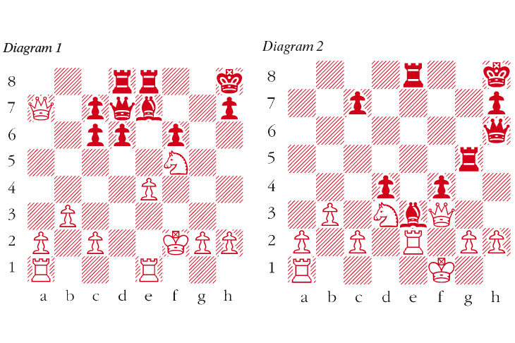 19 Qxa7 (see diagram 1) White has won a pawn and has a big advantage, but the greatest threat to the black king, namely White’s dark-squared bishop, has disappeared. 19 … Bf8 Black’s king is now out of danger, at the cost of a pawn, and he has a clear plan, which is to apply pressure to the isolated pawn on e4 by doubling rooks on the e-file, with the idea of an eventual … d5. 20 Qd4 Re5 21 Rad1 Rde8 22 Qc3 Qf7 23 Ng3 Bh6 Finally, this bishop is able to become active. 24 Qf3 d5 25 exd5 An inaccuracy. 25 Nf5 was appropriate, forcing Black to retreat the bishop. 25 … Be3+ 26 Kf1 cxd5 27 Rd3 This is a clear mistake, handing the advantage to Black; all the black pieces will soon begin to work together in perfect harmony. 27 Nf5 was preferable. 27 … Qe6 28 Re2 f5 29 Rd1 f4 30 Nh1 d4 31 Nf2 Qa6 Lasker conducts the attack with great energy. First he gains control of the centre, and now he wins back a pawn, at the same time effectively breaking into the enemy camp. 32 Nd3 Rg5 33 Ra1 Qh6 (see diagram 2) 34 Ke1 If 34 h3 Black opens lines decisively against the white king with 34 … Rg3 35 Qd5 and now 35 … f3. 34 … Qxh2 35 Kd1 Qg1+ 36 Ne1 Rge5 The pressure along the e-file grows stronger and stronger. 37 Qc6 R5e6 38 Qxc7 R8e7 38 … f3 is also very strong as if 39 gxf3 then 39 … Qg6, preparing to move the bishop or play 40 … Qh5. 39 Qd8+ Kg7 40 a4 f3 Opening lines and preparing the decisive infiltration. 41 gxf3 Bg5 White resigns