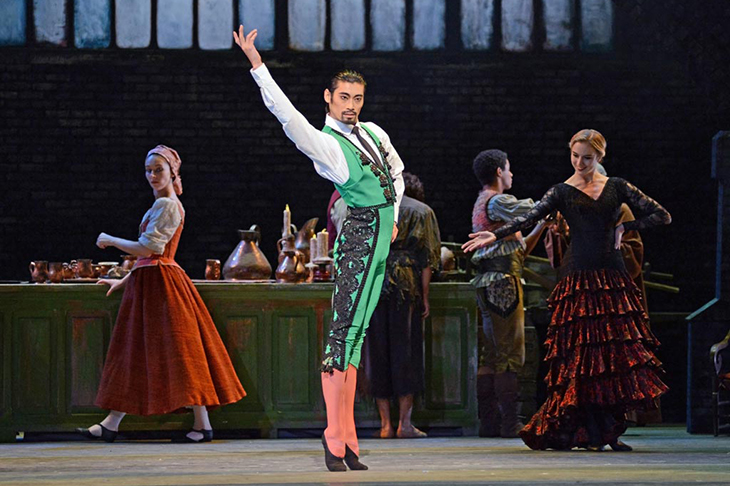 Marianela Nunez as Kitri comes on all guns blazing, all castanets clacking. She is giddy and playful, teasing and proud. Kitri, the innkeeper’s daughter, loves the young barber Basilio (Vadim Muntagirov). Who wouldn’t? One could quibble that Muntagirov is entirely improbable as a swarthy Spaniard — his looks and bearing are more St Petersburg drawing room than bar-room brawl — but at the end of the first and third acts my cheeks ached from smiling. One rarely talks of male dancers being lovely, but there is a lovely lightness to Muntagirov, an infectious gaiety and joie de danse. His legs are like silver compasses, his ballon serene. All set off by a glorious costume and sleek Rioja tights. Hirano’s third act costume, though, takes the prize. In iridescent green he is like a glorious grasshopper leaping and springing and thumbing his nose at boring old gravity.