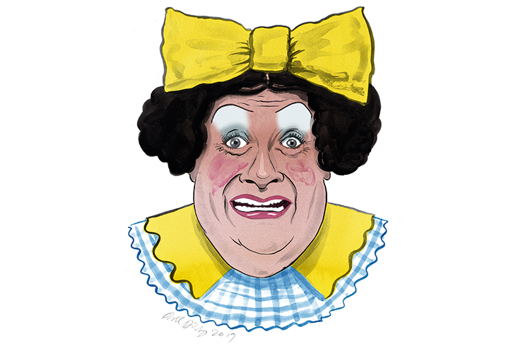I ask Biggins what his favourite dame role is. It’s Mother Goose, the character that was around in the early days of panto in the 18th century — an imported French children’s story. ‘Mother Goose is the Hamlet of all dames. It is all about her and her vanity. She is a tragic heroine. It’s a great shame that there are very few Mother Goose pantos put on these days. Directors say that it isn’t popular enough, but I love the character. I once played her in Swansea when she died at the end of the first act and was carried off to heaven by a 40ft-wingspan goose to the tune of “We’ll Keep a Welcome in the Hillside”. She was resurrected in the second act. There wasn’t a dry eye in the house.’