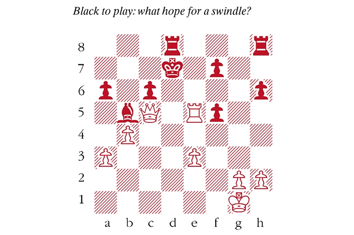 The Complete Chess Swindler (New in Chess), a new book by Australian grandmaster and economist David Smerdon, is a thrilling guide to this netherworld of not-quite-resignable positions. Smerdon has collected all manner of games and tales that implicate amateurs and grandmasters alike. The book can be read as a manual: by grasping the techniques that underpin the turnarounds in these games, the reader may hope to save many half points of their own. But most of all, the perpetrators’ ingenuity, and the concomitant orgy of blunders, provide a simple voyeuristic pleasure. Swindles are fun. Like this, which shows the author’s own flair for the art: