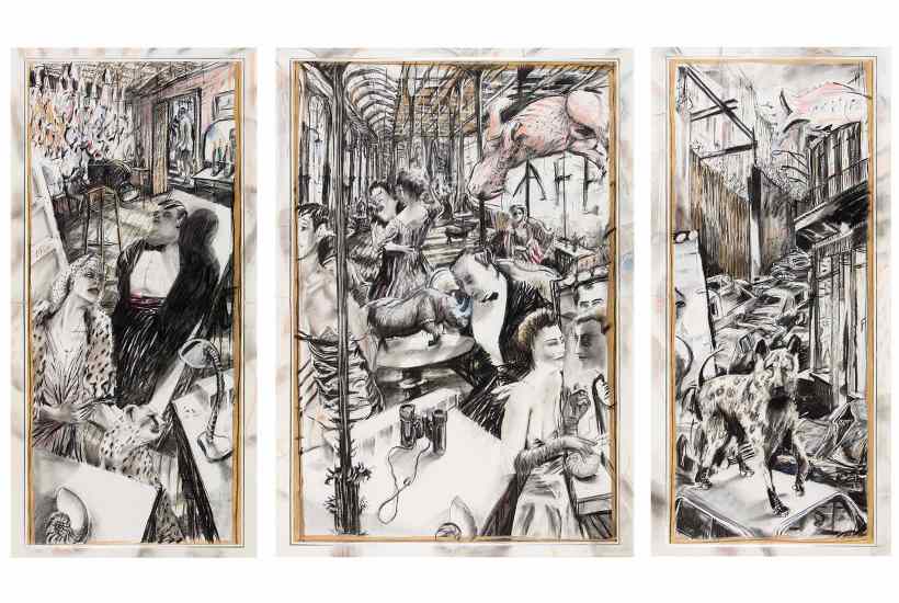 There’s almost no colour in the Royal Academy’s 40-year retrospective of Kentridge’s work; it’s all black and white or smudgy shades of charcoal in between. Nor is there a lot of what purists would term ‘fine art’. Although a brilliant draughtsman, Kentridge came to a career in art out of Johannesburg’s workshop theatre scene and he has never cut his ties with the stage. Along with props and costumes for his chamber opera Waiting for the Sybil (2019), and film footage from his Notes for a Model Opera (2015), the show includes a projection in a mechanised puppet theatre, ‘Black Box/Chambre Noire’ (2005).