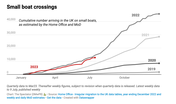 The first string to his bow has already snapped. He has not stopped the boats. He cannot even now claim that he has substantially reduced them. When he went to Dover on June 5, Sunak argued that the fact that crossings were down 20 per cent on 2022 showed his policies were starting to work. But since then we have had a bumper month for crossings which are now only lagging slightly behind last year’s rate and closing fast. It is by no means unlikely that, given continued benign weather in July, small boat arrivals in 2023 will soon overtake those at a matching stage of 2022. At which point Sunak would presumably have to admit he was wrong to say his policies were working.