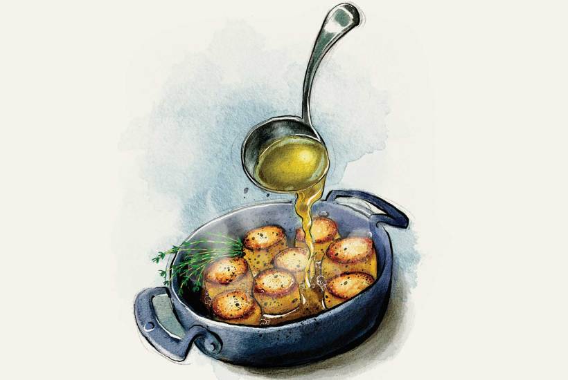 Fondant potatoes are so called because the method of cooking results in a crisp exterior but a meltingly soft – fondant – middle. To make them, potatoes are peeled, then topped and tailed to create flat bottoms; those bottoms are then pan-fried in lots of butter before being roasted in a bath of stock. The flat sides take on the herbed, garlic richness of the infused butter, while the inside is seasoned and flavoured by the stock. They are the Goldilocks of potatoes, not too crunchy, not too soft, with thumpingly good flavour and seasoning all the way through, and with edges that are sticky and slightly caramelised from the reduced stock. They will elevate a roast and can hold their own against a beautifully cooked steak; they’re elegant enough to serve with fish; and they deliver all the best bits of chips, roast potatoes and a potato boulangère in one.