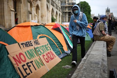 On the grass in front of UCL’s main building, on Sunday night, there were about 30 tents and the portico…
