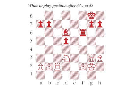 Black to play. Geller–Sveshnikov, USSR Ch 1978. Geller’s last move, 34 Rb1-e1 looked clever, since Black cannot safely capture the…